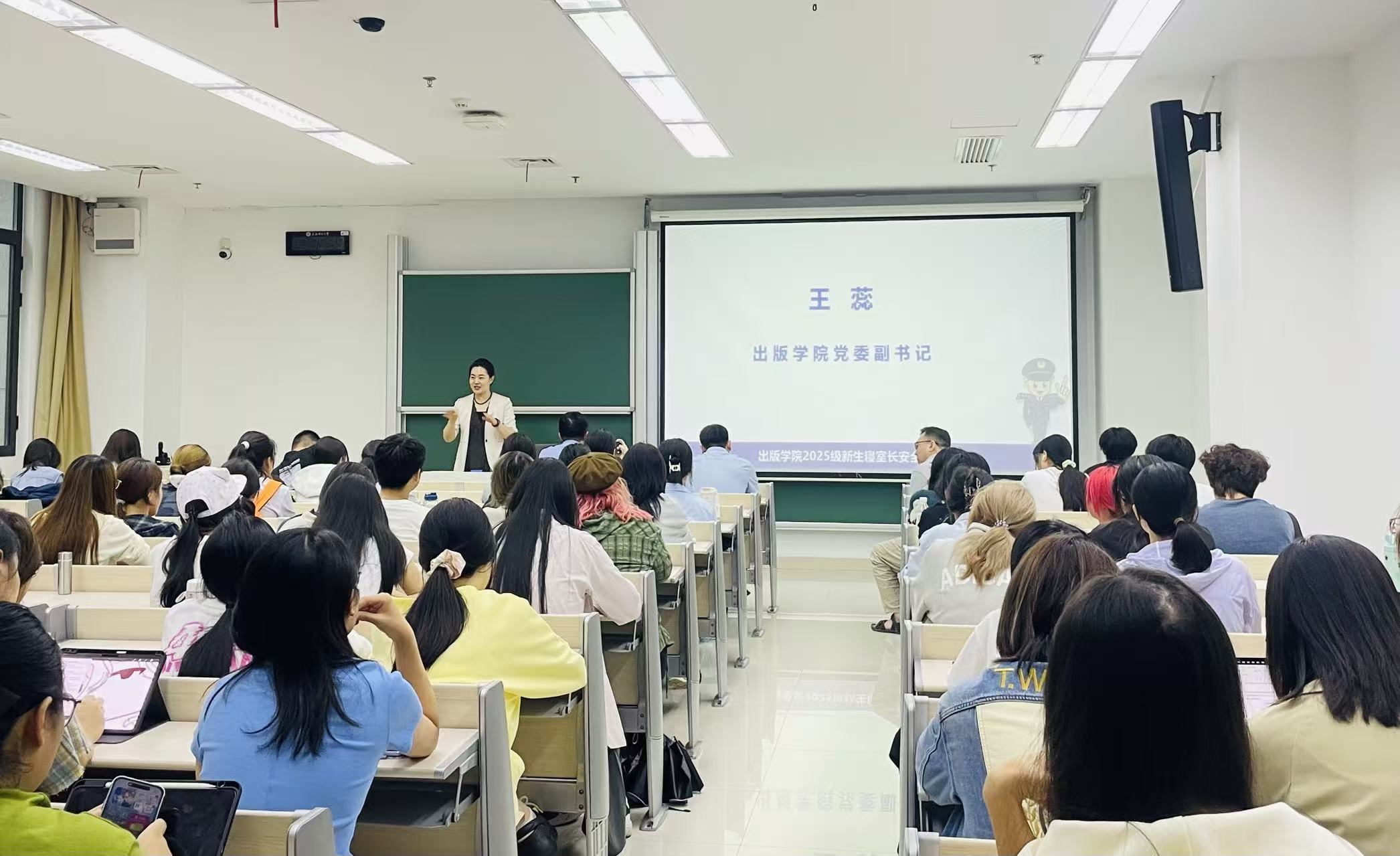 为切实增强新生安全防范意识与自我保护能力,筑牢校园安全的第一道防线,2025年10月14日下午,上海理工大学出版学院联合保卫处在卓越楼135教室面向全体2025级新生寝室长举办安全教育专题讲座。本次讲座以寝室长为关键抓手,致力于通过学生骨干将“安全第一、预防为主”的理念深入传递至每一间寝室,凝聚共识,营造全员参与、共筑平安和谐的校园环境。出版学院党委副书记王蕊、上海市反电信网络诈骗中心探长范华和保卫处张宸卿出席本次活动。