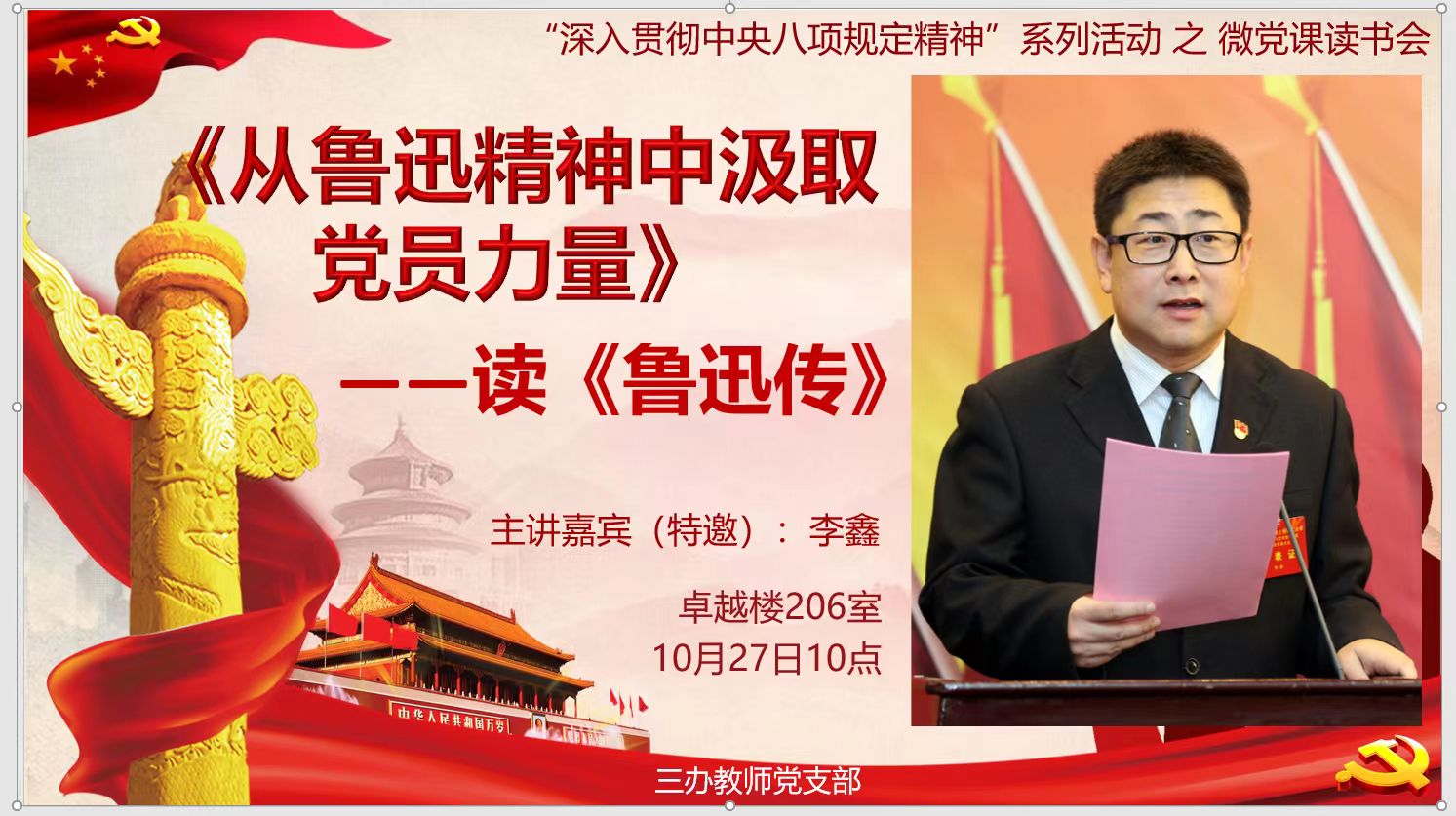 1937年10月19日,毛泽东在延安陕北公学纪念鲁迅逝世周年大会上的讲话中概括了鲁迅精神的三个特点:政治的远见、斗争精神、牺牲精神。1991年9月24日,江泽民在鲁迅诞辰110周年纪念大会上发表的《进一步学习和发扬鲁迅精神》的重要讲话中,强调“面对错综复杂的国际形势和艰难繁重的国内建设与改革任务,不仅文化战线的同志要义不容辞地学习鲁迅、宣传鲁迅,而且广大工人、农民、知识分子和各条战线的干部,都要进一步学习和发扬鲁迅精神。作为高校教师群体,此次举办鲁迅传记主题读书会,旨在进一步激发党员教师们的精神力量,涵养爱国情怀和奋斗精神。