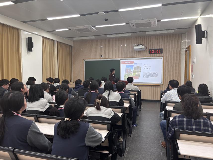 下午两点,在第一教学楼133教室环境设计系杨潇雨为松江四中的师生们作学校、专业宣讲会,详细介绍了我校的历史沿革、办学特色与校园文化,更从艺术类考生的角度出发,对学校产品设计、视觉传达设计、动画、环境设计艺术类专业展开介绍,为学生们未来的专业选择提供了参考。