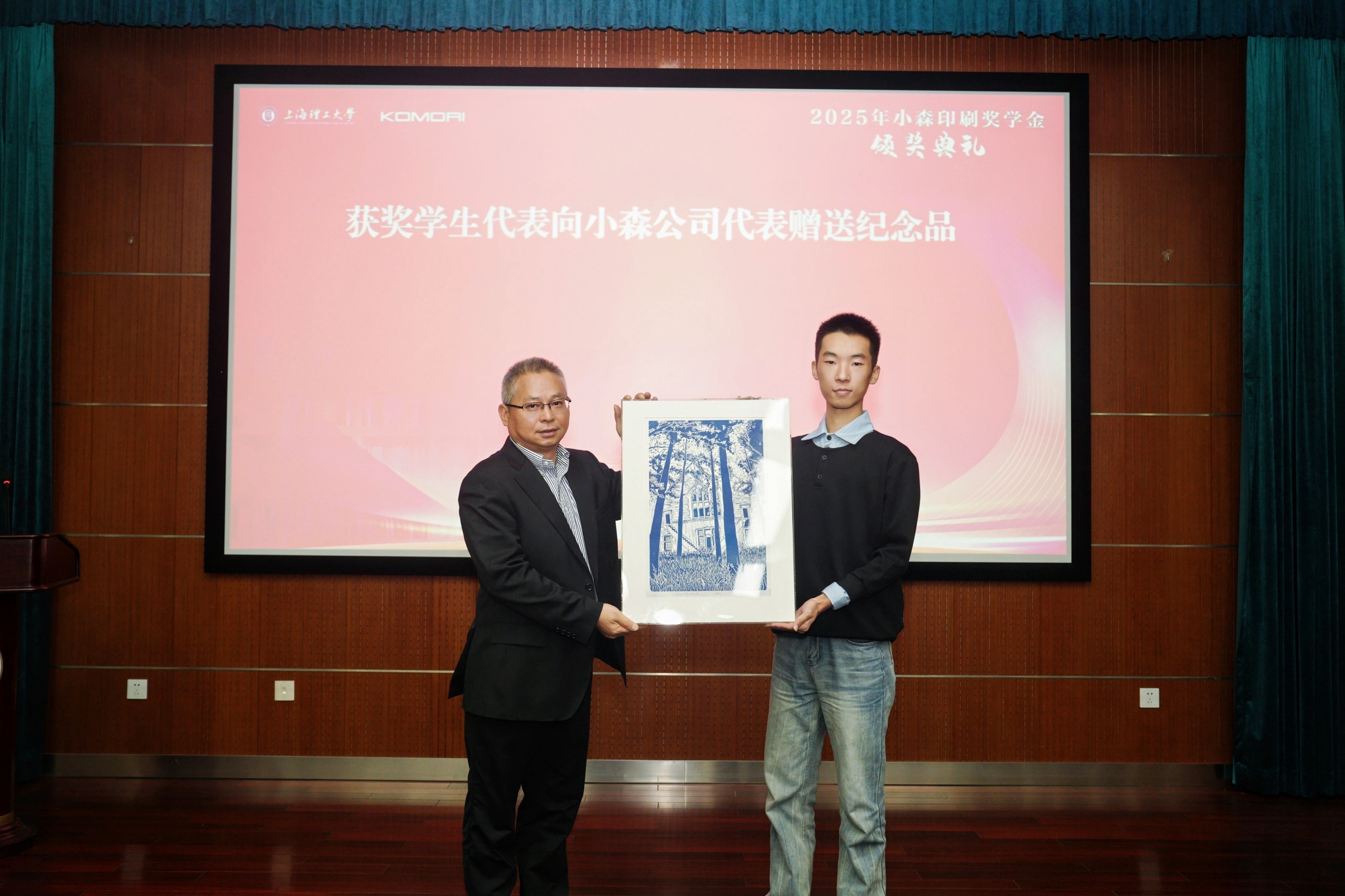 获奖同学代表李姝贤向小森公司赠予纪念品,该画以我校北欧大草坪历史建筑群为原型,采用传统的手工版画技艺制作而成,展现了两国之间的友好合作以及我校对小森公司的美好祝愿。