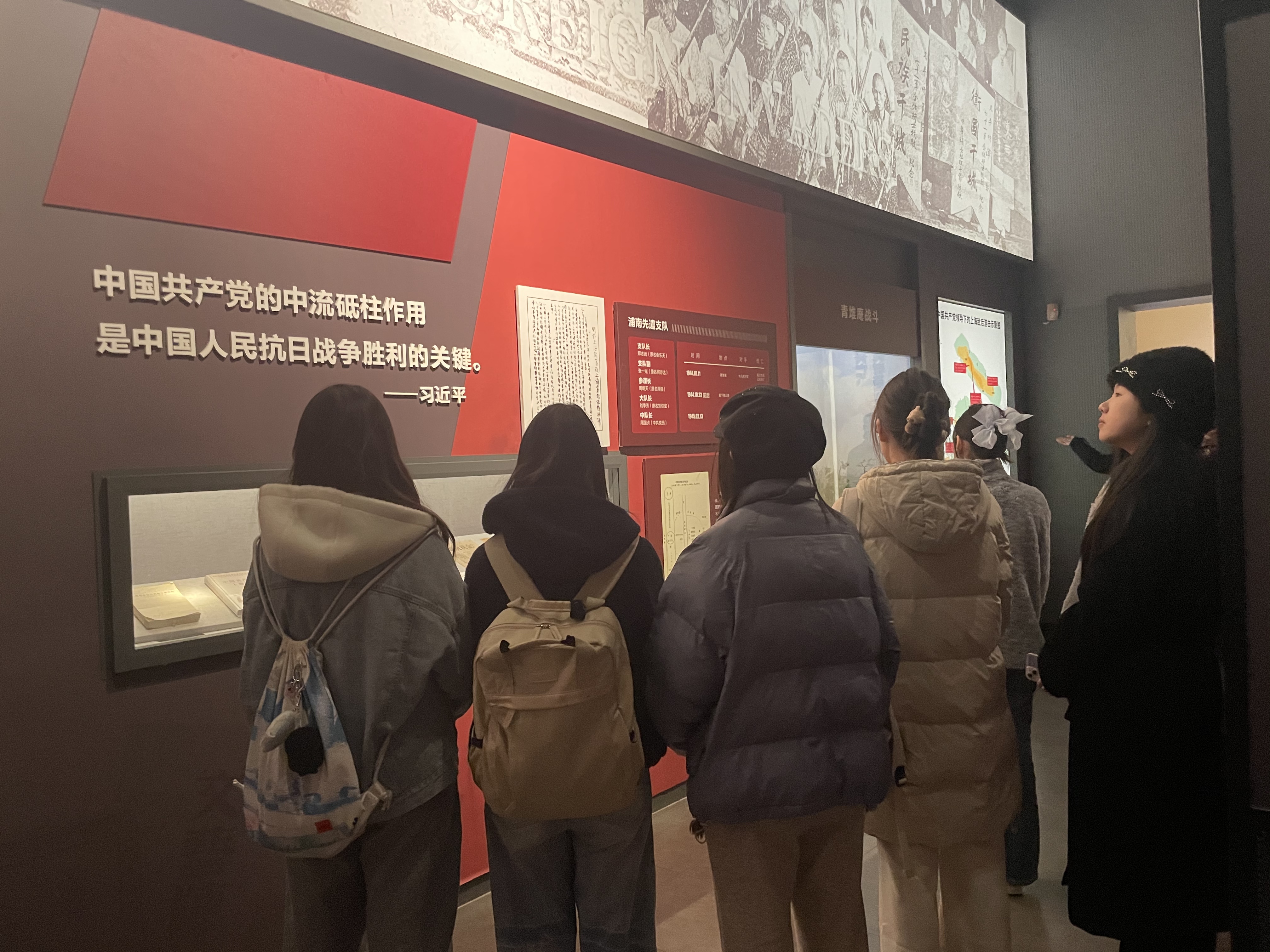 随后,众人走进抗战史料陈列馆。馆内以金山卫抗战史实为主线,依托图片史料、珍贵文物、主题雕塑、微缩景观,辅以多媒体展陈手段,全方位展示在中国共产党倡导建立的抗日民族统一战线旗帜下,金山军民在抗日战争时期同仇敌忾、众志成城、英勇奋斗的历史画卷和可歌可泣的英雄事迹。一个个鲜活的故事、一件件斑驳的实物,让师生真切感受到中华儿女在民族危亡之际,宁死不屈、保家卫国的铮铮铁骨,中国共产党在抗日战争中的“中流砥柱”作用及抗日民族统一战线中各支力量的相互配合。