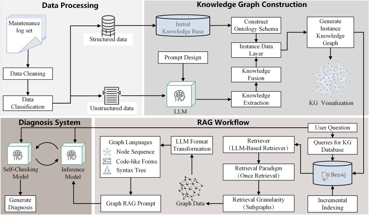 研究团队构建了一套包含四阶段的全流程诊断框架:数据预处理标准化多模态故障记录;基于大语言模型的自动化知识图谱构建,并通过提示工程融入领域知识;图编码和检索将知识图谱转化为结构化图嵌入,实现基于查询向量的精确子图检索;以及基于检索上下文的可解释故障分类与归因分析。该框架不仅显著提升了诊断准确性,更通过知识图谱实现了故障因果链的可视化与可验证,为铁路安全运维提供了可信任的智能决策支持。