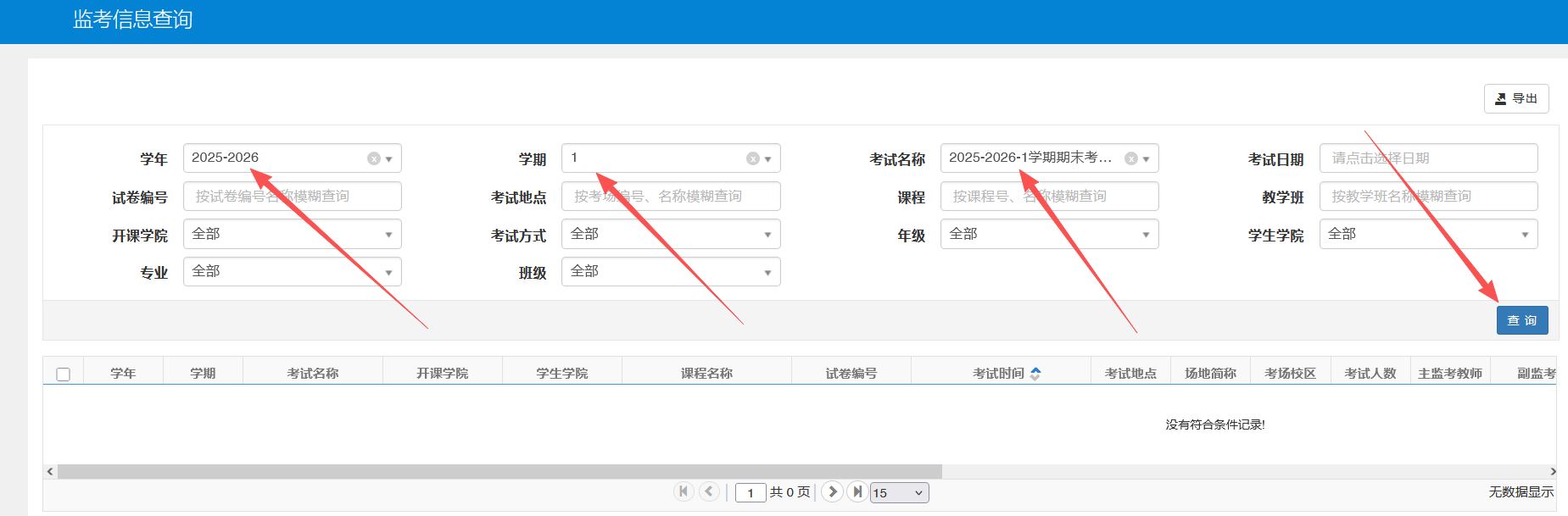 请您自行登录教务系统→菜单栏 选择【信息查询】→选择【监考信息查询】→学年选择【2025-2026】学期选择【1】→考试名称选择【2025-2026-1学期期末考试】点击【查询】,即可看到自己本学期的监考信息,具体流程查看示意截图。