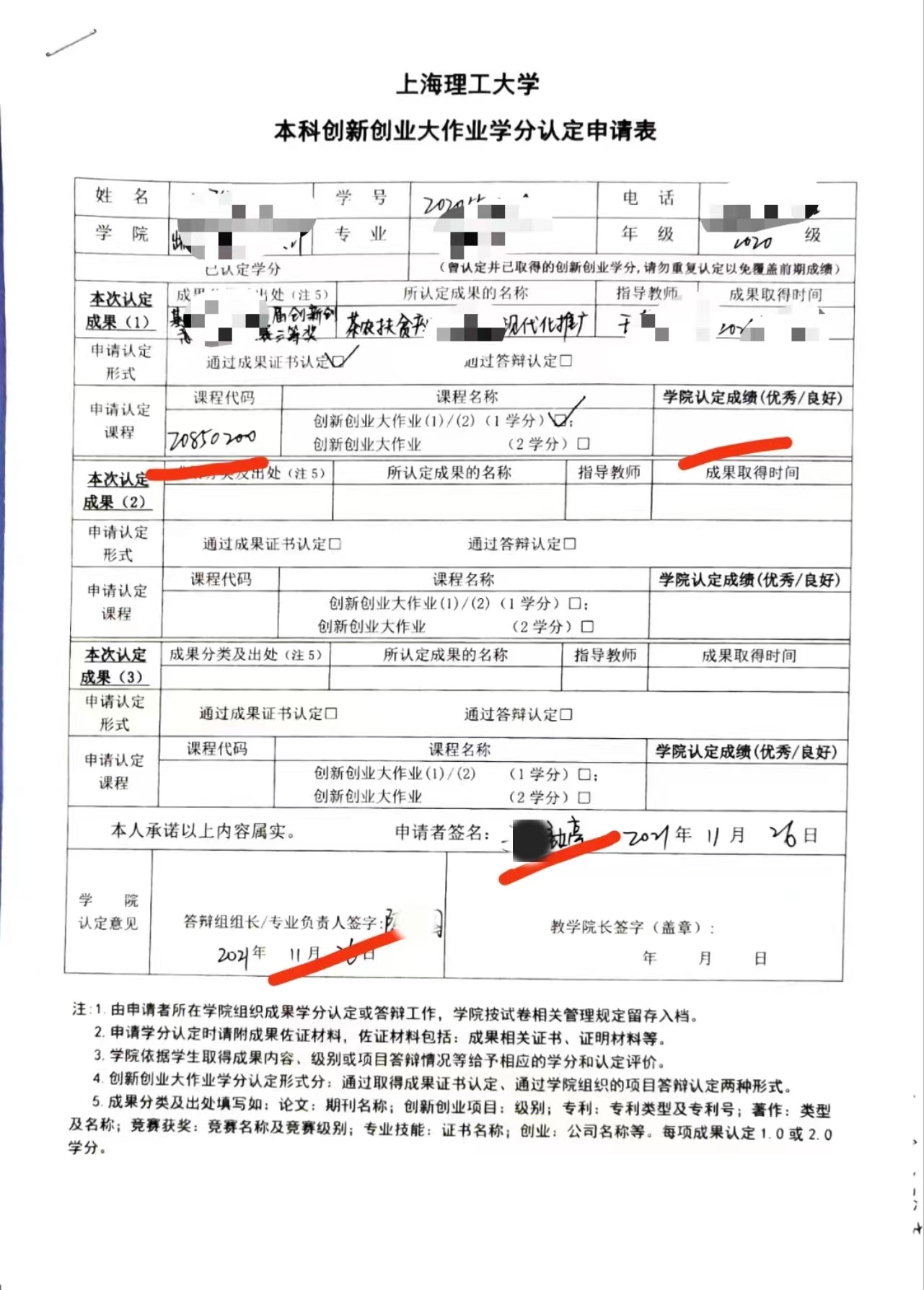 2.学分认定申请表:填写附件1打包文件中的申请表。表中“申请者签名”处需附上本人签名,“学院认定意见”处需要相应专业负责人或辅导员签字。一份完整的申请表示例请见附件2;