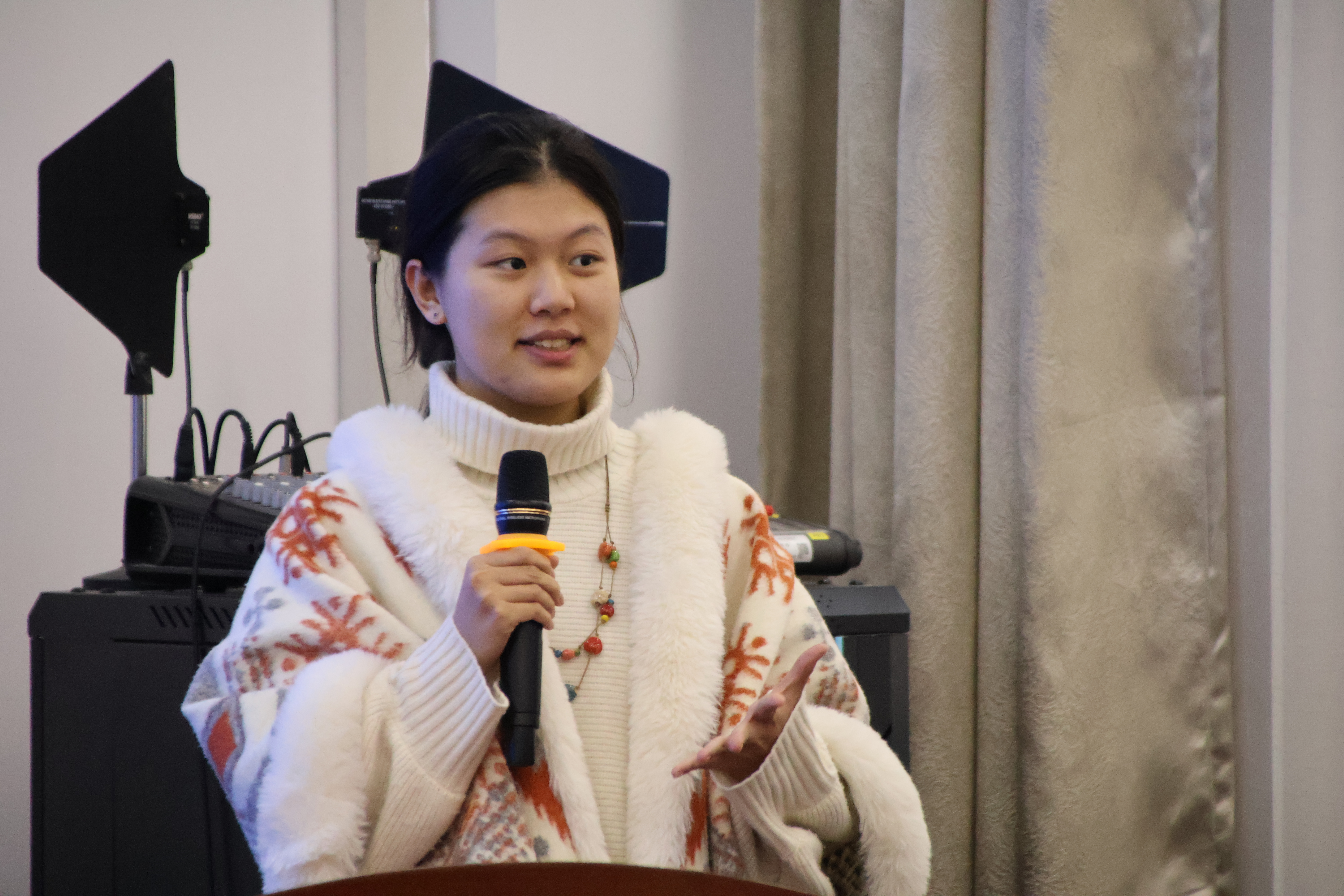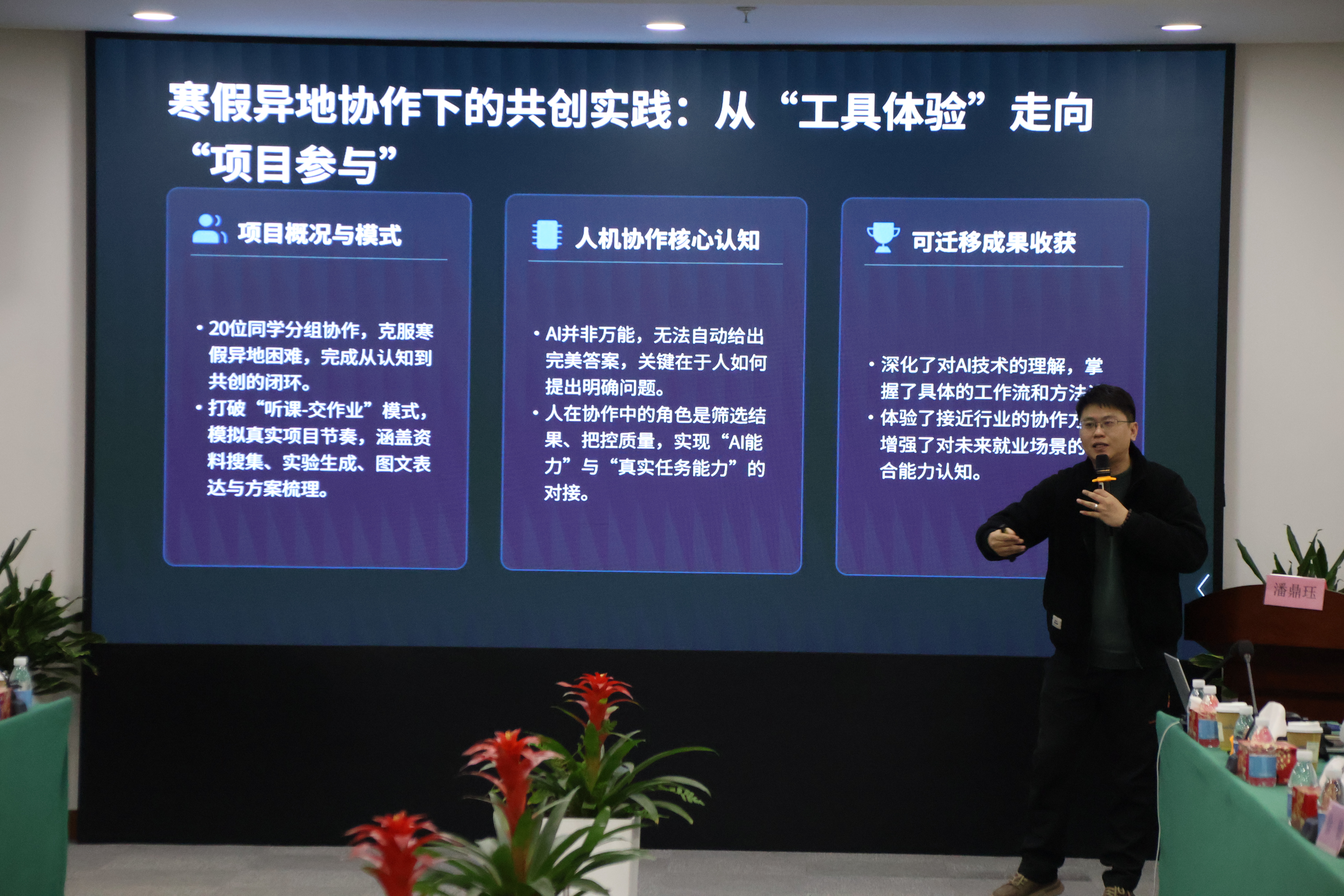 2025级设计类杨姝媛作为学生代表分享了学习体会。她表示,通过实战掌握了AIGC工具在具体产业场景中的应用方法,产出的数据标签规范与训练计划等成果,也让自己完成了从“AI使用者”向“AI项目管理者”的角色转变。