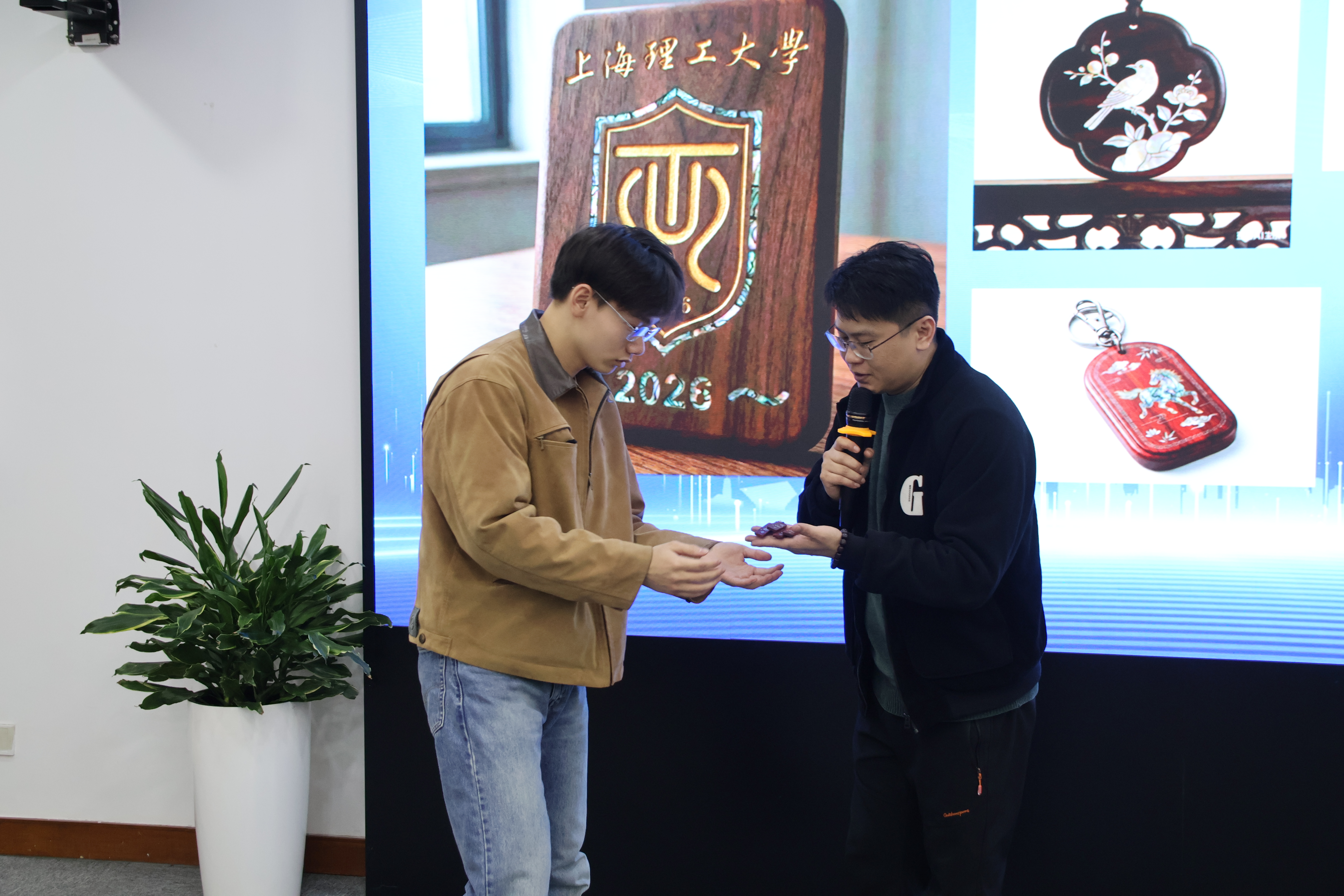 企业代表向学员们赠送师生共创设计制作的螺钿纪念品